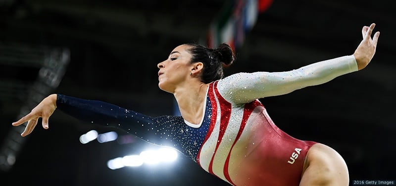 Aly Raisman competes on the vault in the artistic gymnastics women's team final at the Rio 2016 Olympic Games at the Rio Olympic Arena on Aug. 9, 2016 in Rio de Janeiro. Raisman scored a 15.833 on vault.