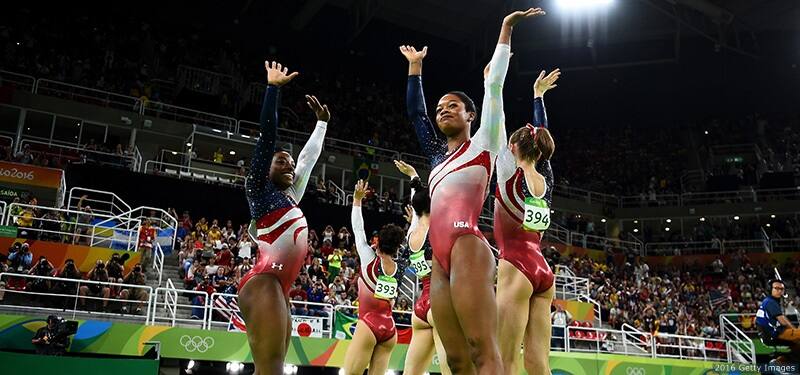 (L-R) Simone Biles, Laurie Hernandez, Aly Raisman, Gabby Douglas and Madison Kocian celebrate winning the gold medal in the artistic gymnastics women’s team final at the Rio 2016 Olympic Games at the Rio Olympic Arena on Aug. 9, 2016 in Rio de Janeiro.