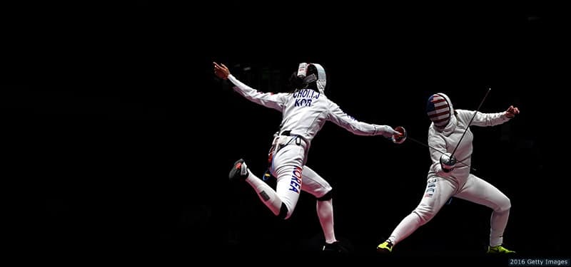 Courtney Hurley (R) competes against Injeong Choi of Korea in the women's epee team placement 5-6 bout at the Rio 2016 Olympic Games at Carioca Arena 3 on Aug. 11, 2016 in Rio de Janeiro.