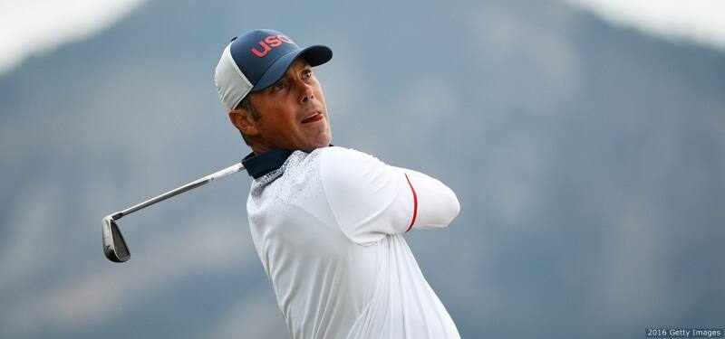 Matt Kuchar plays his shot from the fourth tee in the first round of men's golf at the Rio 2016 Olympic Games at the Olympic Golf Course on Aug. 11, 2016 in Rio de Janeiro. Kuchar finished the day tied for 11th.