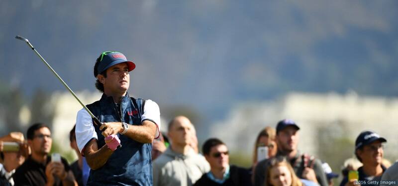 Bubba Watson plays his shot from the fourth tee in the first round of men's golf at the Rio 2016 Olympic Games at the Olympic Golf Course on Aug. 11, 2016 in Rio de Janeiro. Watson finished the day tied for 42nd.