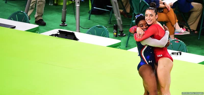 Simone Biles and Aly Raisman celebrate finishing first and second, respectively, in the women's individual all-around final at the Rio 2016 Olympic Games at Rio Olympic Arena on Aug. 11, 2016 in Rio de Janeiro.