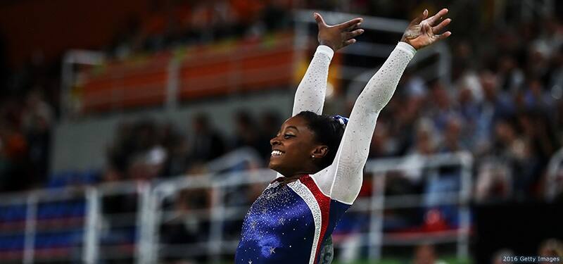 Simone Biles reacts after competing on the balance beam in the women's individual all-around final at the Rio 2016 Olympic Games at Rio Olympic Arena on Aug. 11, 2016 in Rio de Janeiro.