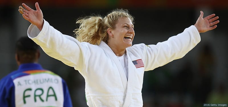 Kayla Harrison celebrates after defeating Audrey Tcheumeo of France in the women's -78 kg. gold medal judo contest at the Rio 2016 Olympic Games at Carioca Arena 2 on Aug. 11, 2016 in Rio de Janeiro.