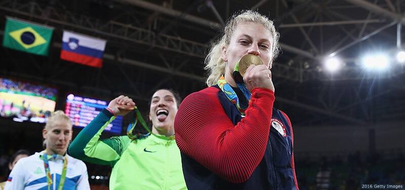 Kayla Harrison celebrates with her gold medal for women's -78 kg. judo at the Rio 2016 Olympic Games at Carioca Arena 2 on Aug. 11, 2016 in Rio de Janeiro.