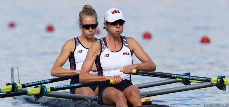 (L-R) Devery Karz and Kate Bertko compete in the lightweight women's double sculls semifinals at the Rio 2016 Olympic Games at Lagoa Stadium on Aug. 11, 2016 in Rio de Janeiro.
