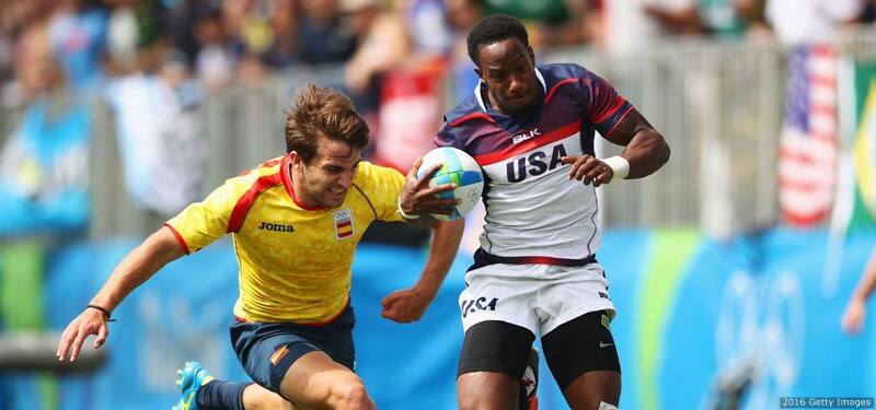 Carlin Isles evades a tackle by Marcos Poggi of Spain in the men's rugby sevens placing match between the United States and Spain at the Rio 2016 Olympic Games at Deodoro Stadium on Aug. 11, 2016 in Rio de Janeiro.