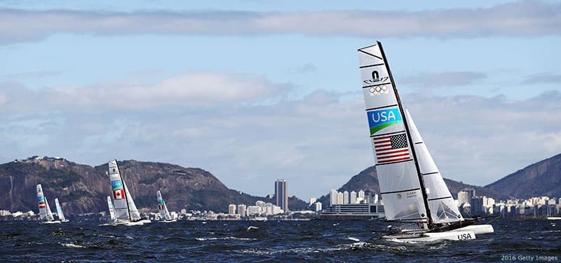Bora Gulari and Louisa Chafee compete in the Nacra 17 mixed class at the Rio 2016 Olympic Games at Marina da Gloria on Aug. 11, 2016 in Rio de Janeiro.