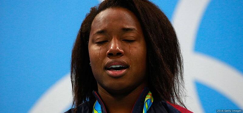 Gold medalist Simone Manuel celebrates on the podium at the medal ceremony for the women's 100-meter freestyle final at the Rio 2016 Olympic Games at the Olympic Aquatics Stadium on Aug. 11, 2016 in Rio de Janeiro.