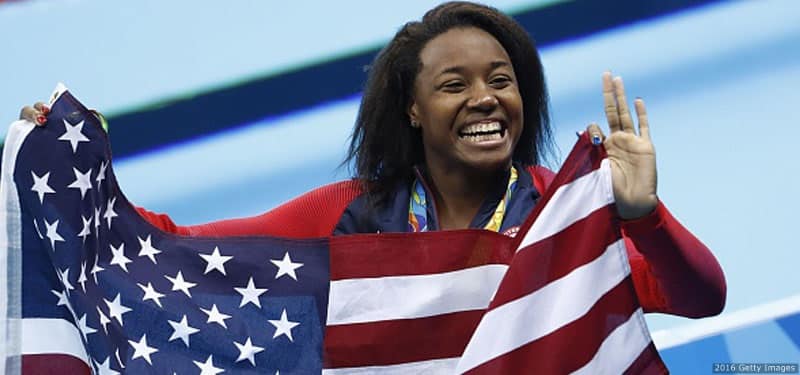 Simone Manuel celebrates winning gold in the women's 100-meter freestyle at the Rio 2016 Olympic Games at the Olympic Aquatics Stadium on Aug. 11, 2016 in Rio de Janeiro.