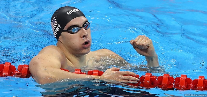 Ryan Murphy celebrates after winning gold in the men's 200-meter backstroke at the Rio 2016 Olympic Games at the Olympic Aquatics Stadium on Aug. 11, 2016 in Rio de Janeiro.