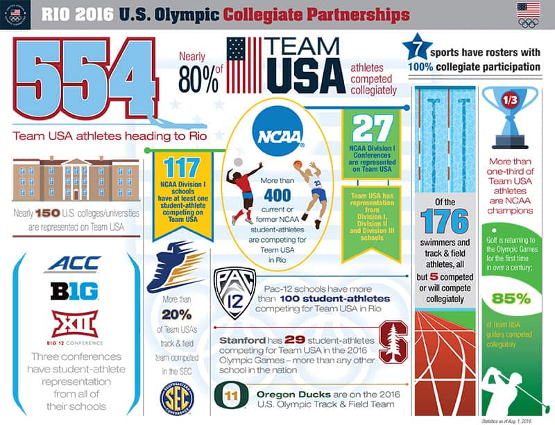 Team USA has 555 athletes in Rio. Of those, 436 participated in collegiate sports or will begin this fall. That means nearly 80 percent of the American contingent in Rio has dealt with signing up for classes, making it to class and juggling things like studying, sports practice and just being a college kid.