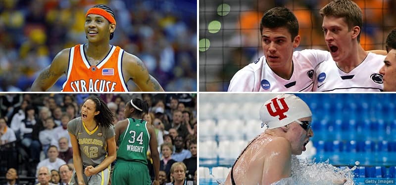 (Clockwise from top left) Carmelo Anthony (basketball), Matt Anderson and Max Holt (volleyball), Lilly King (swimming) and Brittney Griner (basketball) are some of Team USA's many athletes who have also starred in collegiate athletics.