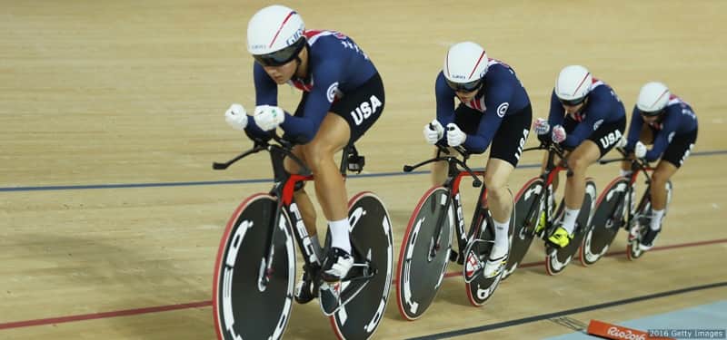 Team USA competes in the women's team pursuit at the Rio 2016 Olympic Games at the Rio Olympic Velodrome on August 13, 2016 in Rio de Janeiro, Brazil. (Photo by Bryn Lennon/Getty Images)