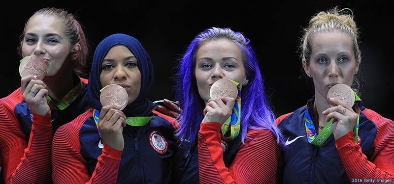 Bronze medalists Monica Aksamit, Ibtihaj Muhammad, Dagmara Wozniak and Mariel Zagunis celebrate on the podium after winning the women's saber team bronze-medal match between United States and Italy at the Rio 2016 Olympic Games at Carioca Arena 3 on Aug. 13, 2016 in Rio de Janeiro.