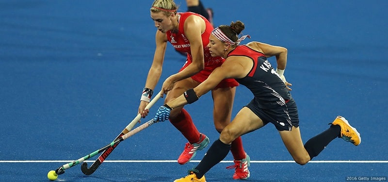 Lily Owsley (L) of Great Britain is tackled by Michelle Kasold at the women's Group B hockey match between Great Britain and the United States at the Rio 2016 Olympic Games at the Olympic Hockey Centre on Aug. 13, 2016 in Rio de Janeiro.