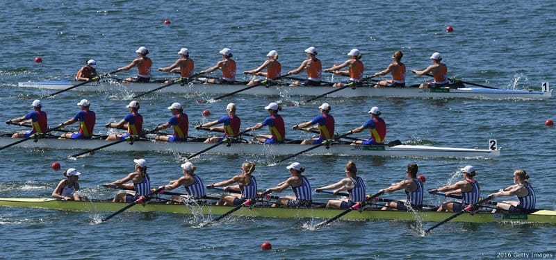 (Bottom to top) The U.S., Romania and Netherlands compete in the women's eight final at the Rio 2016 Olympic Games at the Lagoa Stadium on Aug. 13, 2016 in Rio de Janeiro.