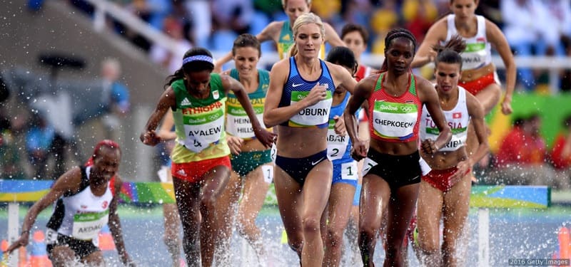 Emma Coburn competes in the women's 3,000-meter steeplechase at the Rio 2016 Olympic Games at the Olympic Stadium on Aug. 13, 2016 in Rio de Janeiro.