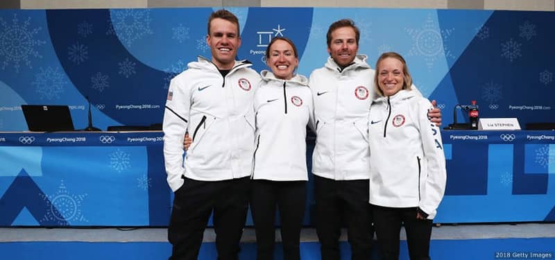 Matt Hamilton delivers a stone against Kijeong Lee and Hyeji Jang of Korea in the curling mixed doubles round-robin match at the Olympic Winter Games PyeongChang 2018 on Feb. 9, 2018 in Gangneung, South Korea.
