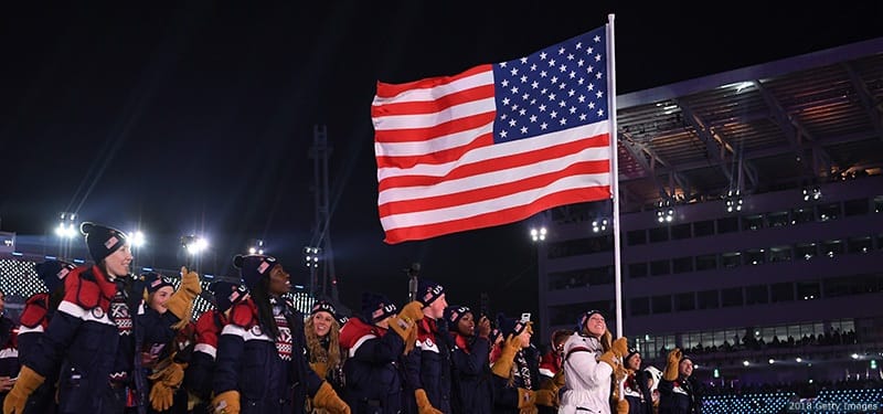 Flag bearer Erin Hamlin leads the team in the Parade of Nations during the Opening Ceremony of the Olympic Winter Games PyeongChang 2018 on Feb. 9, 2018 in PyeongChang, South Korea.