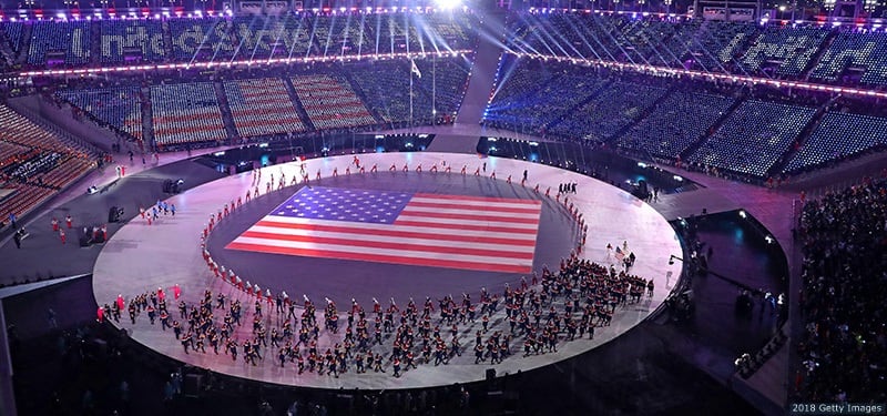 A general view as flag bearer Erin Hamlin and teammates enter the stadium during the Opening Ceremony of the Olympic Winter Games PyeongChang 2018 on Feb. 9, 2018 in PyeongChang, South Korea.