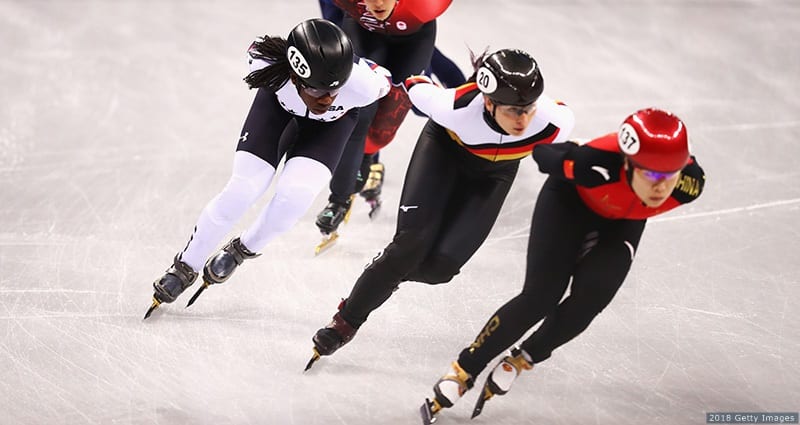 Maame Biney (L) competes in the short track speedskating women's 1,500-meter at the Olympic Winter Games PyeongChang 2018 on Feb. 17, 2018 in Gangneung, South Korea.