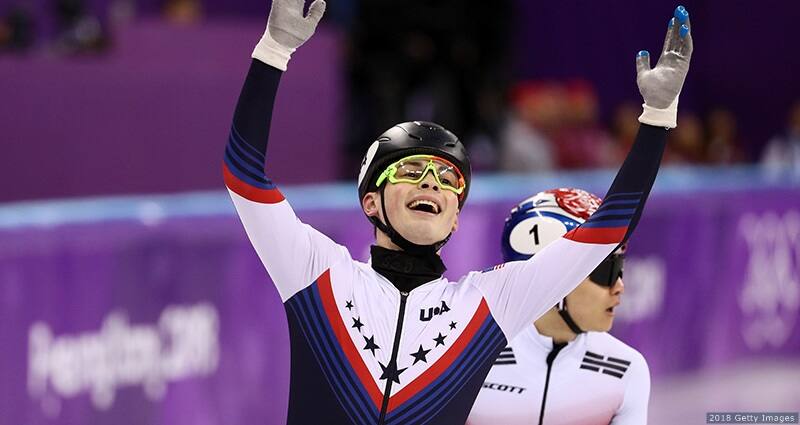 John-Henry Krueger celebrates after his race in the short track speedskating men's 1,000-meter semifinals at the Olympic Winter Games PyeongChang 2018 on Feb. 17, 2018 in Gangneung, South Korea.