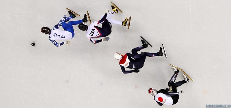 John-Henry Krueger competes in the short track speedskating men's 1,000-meter quarterfinals at the Olympic Winter Games PyeongChang 2018 on Feb. 17, 2018 in Gangneung, South Korea.