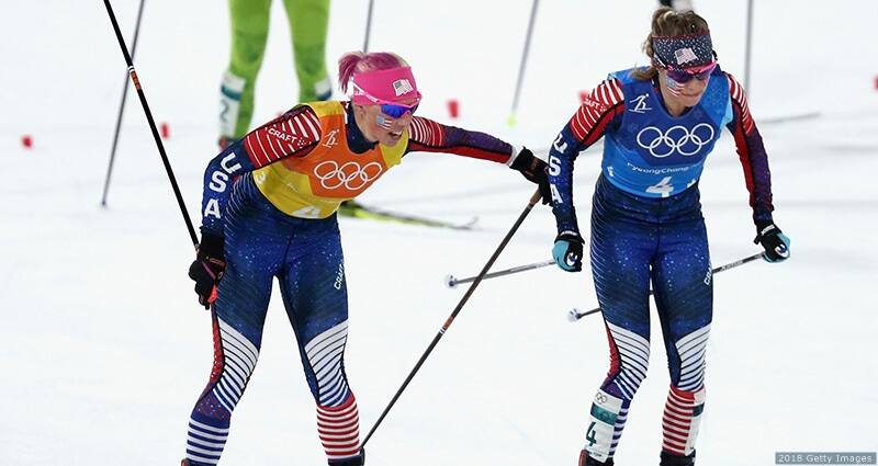 Kikkan Randall hands over to Jessica Diggins in the women's 4x5-kilometer relay the the Olympic Winter Games PyeongChang 2018 on Feb. 17, 2018 in PyeongChang, South Korea.