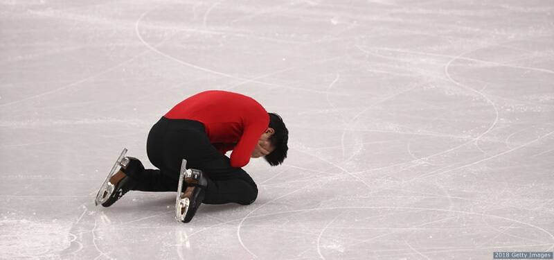 Vincent Zhou reacts after competing in the men's single free program at the Olympic Winter Games PyeongChang 2018 on Feb. 17, 2018 in Gangneung, South Korea.