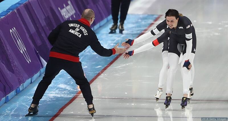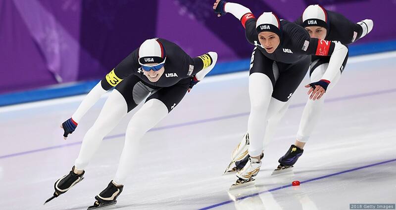 Mia Manganello, Brittany Bowe and Heather Bergsma compete in the women's team pursuit speed skating quarterfinals at the Olympic Winter Games PyeongChang 2018 on Feb. 19, 2018 in Gangneung, South Korea.