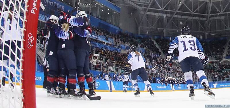 Danielle Cameranesi is mobbed by her teammates after scoring in the first period against Finland in the ice hockey women playoffs semifinals at the Olympic Winter Games PyeongChang 2018 on Feb. 19, 2018 in PyeongChang, South Korea.
