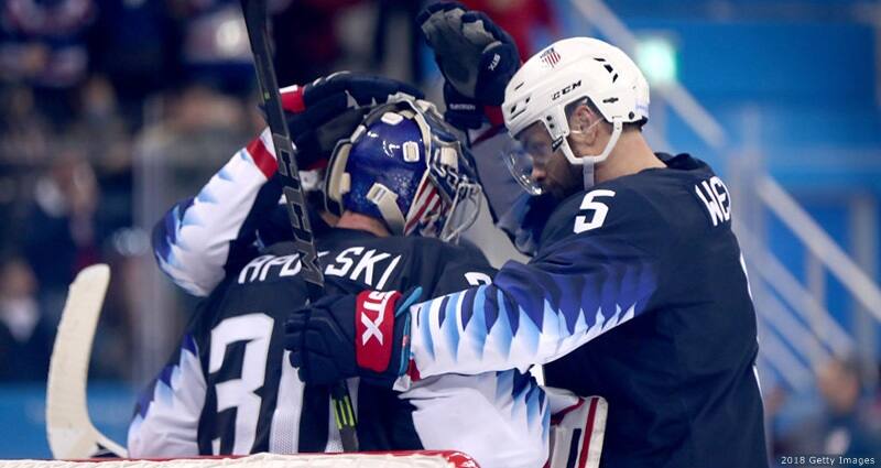 Ryan Zapolski (#30) and Noah Welch (#5) celebrate after defeating Slovakia in the men's play-offs qualifications game at the Olympic Winter Games PyeongChang 2018 on Feb. 20, 2018 in Gangneung, South Korea.