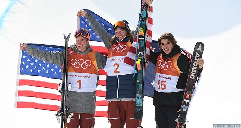 (L-R) Alex Ferreira, David Wise and Nico Porteous of New Zealand celebrate at the victory ceremony for men's ski halfpipe at the Olympic Winter Games PyeongChang 2018 at Phoenix Snow Park on Feb. 22, 2018 in PyeongChang, South Korea.