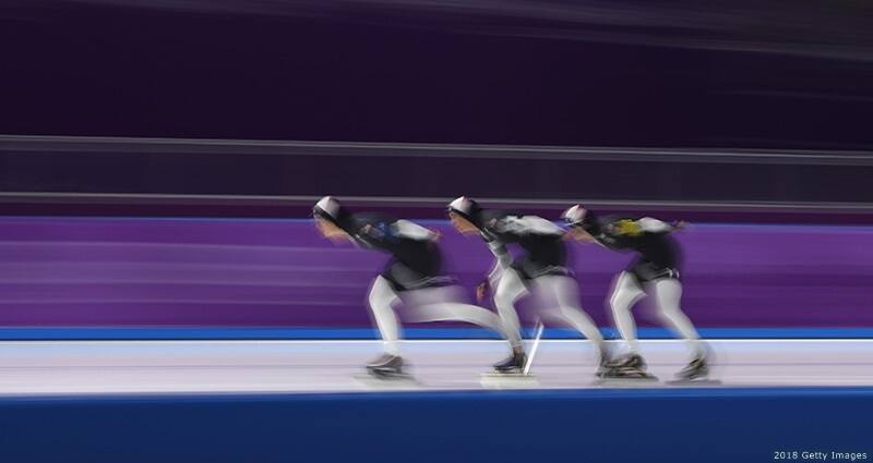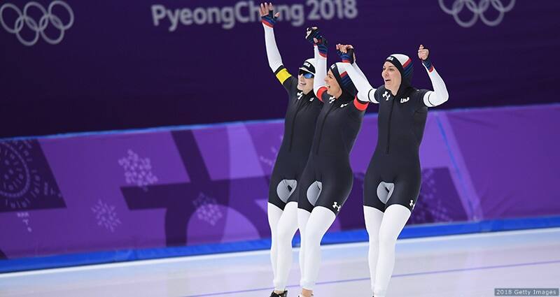 Mia Manganello, Carlijn Schoutens and Heather Bergsma compete in the women's team pursuit semifinal at the Olympic Winter Games PyeongChang 2018 on Feb. 21, 2018 in Gangneung, South Korea.