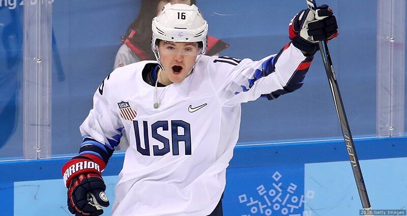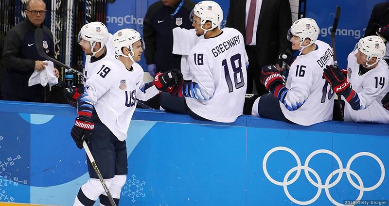 Ryan Donato celebrates after scoring a goal against Czech Republic in the men's hockey quarterfinals at the Olympic Winter Games PyeongChang 2018 on Feb. 21, 2018 in Gangneung, South Korea.