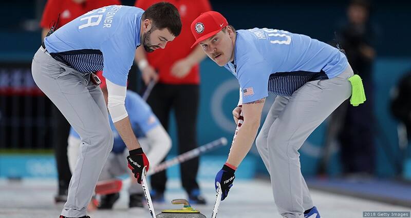 (L-R) John Landsteiner and Matt Hamilton in action in the curling round robin matches at the Olympic Winter Games PyeongChang 2018 on Feb. 21, 2018 in Gangneung, South Korea.