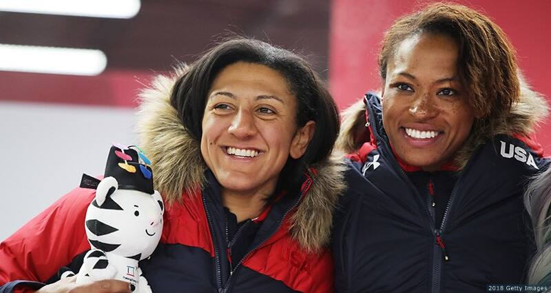Elana Meyers Taylor and Lauren Gibbs celebrate winning silver in women's bobsled at the Olympic Winter Games PyeongChang 2018 on Feb. 21, 2018 in PyeongChang, South Korea.