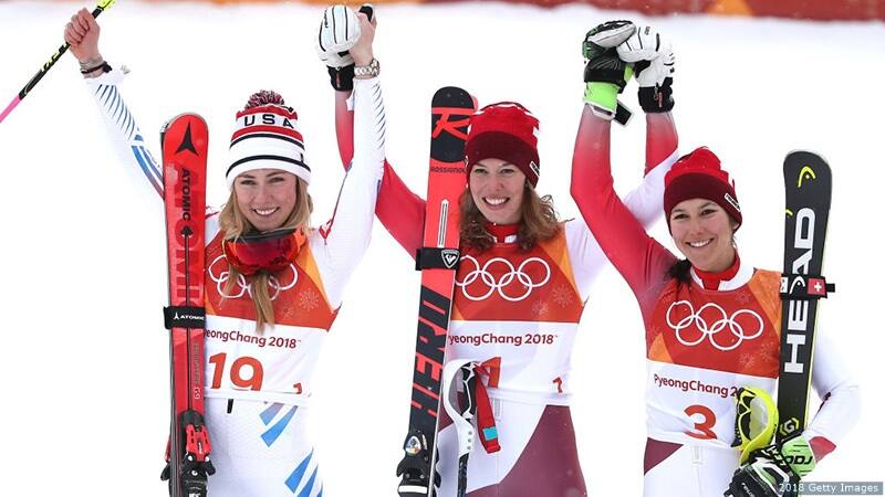 (L-R) Mikaela Shiffrin, Michelle Gisin of Switzerland and Wendy Holdener of Switzerland celebrate after the women's alpine combined at the Olympic Winter Games PyeongChang 2018 on Feb. 22, 2018 in PyeongChang, South Korea.