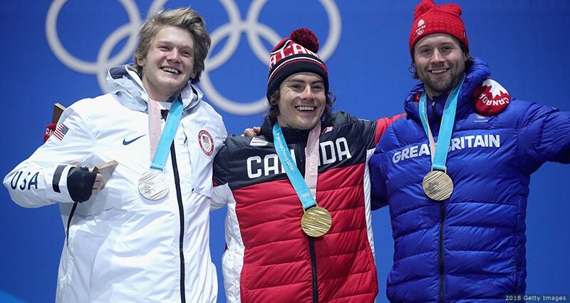 (L-R) Silver medal winner Kyle Mack, gold medal winner Sebastien Toutant of Canada and bronze medal winner Billy Morgan of Great Britain celebrate during the medal ceremony for snowboard men's big air at the Olympic Winter Games PyeongChang 2018 on Feb. 24, 2018 in PyeongChang, South Korea.