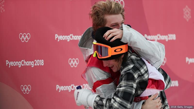 Kyle Mack is congratulated by teammate Red Gerard after winning the silver medal in men's snowboard big air at the Olympic Winter Games PyeongChang 2018 on Feb. 24, 2018 in PyeongChang, South Korea.