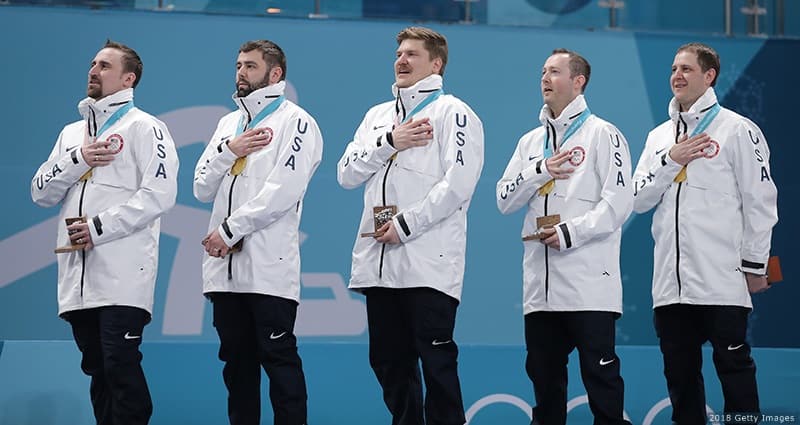Gold medalists Team Shuster look on during the national anthem in the victory ceremony for men's curling at the Olympic Winter Games PyeongChang 2018 on Feb. 24, 2018 in Gangneung, South Korea.