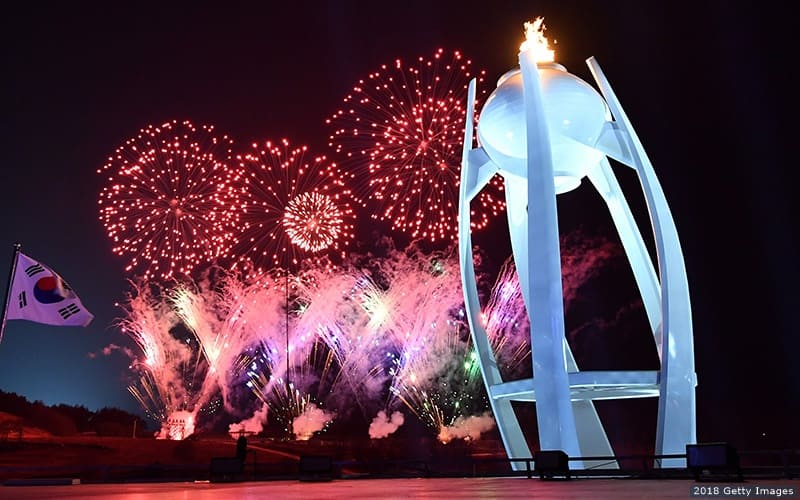 Fireworks explode behind the flame at the Closing Ceremony of the Olympic Winter Games PyeongChang 2018 on Feb. 25, 2018 in PyeongChang, South Korea.