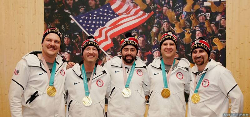 (L-R) Matt Hamilton, Tyler George, John Landsteiner, John Shuster and Joe Polo pose for a picture on Feb. 24, 2018 in PyeongChang, South Korea.