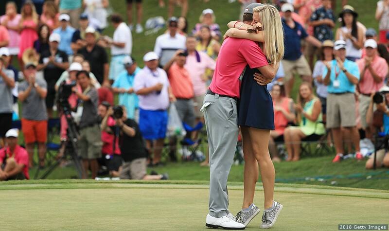 Webb Simpson celebrates with his wife Dowd on the 18th green after winning THE PLAYERS Championship on May 13, 2018 in Ponte Vedra Beach, Fla.