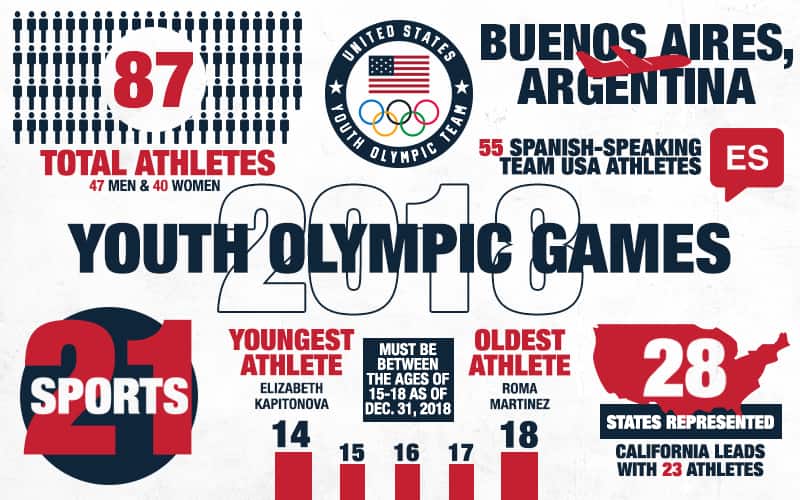 COLORADO SPRINGS, Colo. – The United States Olympic Committee today announced the 87-member U.S. Youth Olympic Team that will compete at the Summer Youth Olympic Games Buenos Aires 2018 from Oct. 6-18 in Argentina. The 12-day competition for athletes between the ages of 15 and 18 will feature 32 sports and 36 disciplines. More than 4,000 athletes from 206 nations are expected to participate.