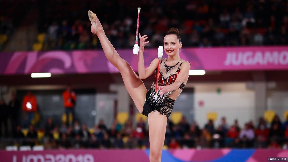 Evita Griskenas preforming during the clubs final at the Pan American Games Lima 2019 on Aug. 5, 2019 in Lima, Peru.