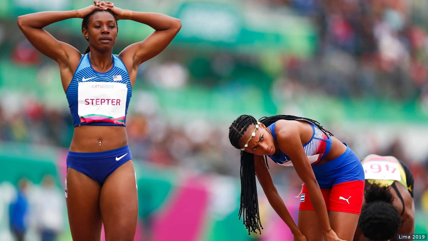 (L-R) Jaide Stepter and Roxana Gomez (Cuba) after competing in the women's 400-meter hurdle semifinal at the Pan American Games Lima 2019 on Aug. 7, 2019 in Lima, Peru.