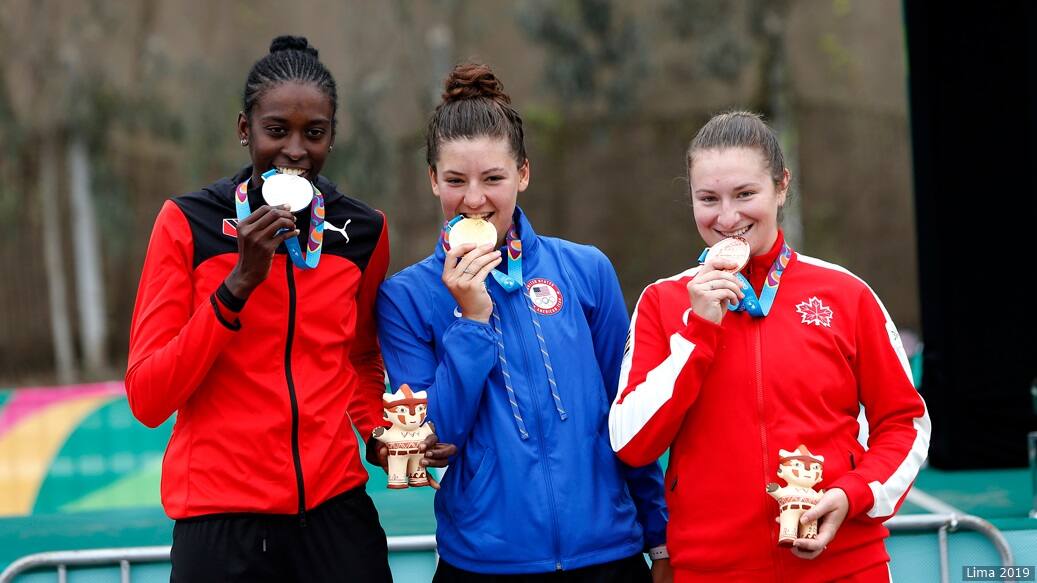 (L-R) Teniel Campbell (Trinidad and Tobago), Chloe Dygert Owen and Laurie Jussaume (Canada) posing at the medal ceremony for the women's road cycling finals at the Pan American Games Lima 2019 on Aug. 7, 2019 in Lima, Peru.