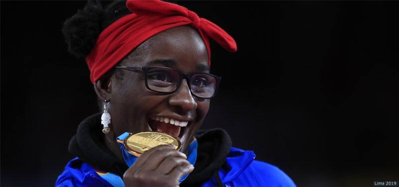 Tamyra Mensah-Stock celebrates with her gold medal at the Pan American Games Lima 2019 on Aug. 9. 2019.